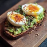 Montage de la tartine : Étale généreusement l’avocat sur le pain chaud, puis coupe les œufs en deux et dépose-les délicatement sur l’avocat. Ajoute les graines, saupoudre avec un peu de piment doux ou flocons de piment, termine avec un filet d’huile d’olive et une pincée de sel.