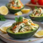 Un plat délicieux et frais d’avocats farcis au poulet et aux légumes, parfait pour impressionner vos amis et famille.