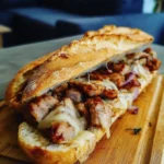 Un sandwich savoureux de baguette croustillante garni de viande grillée, de fromage fondant et d’une sauce crémeuse.