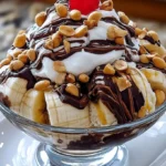 Vous avez envie de quelque chose de succulent, de jovial, et d’un brin chocolaté ? Ne cherchez pas plus loin ! Le Banana Split Gourmand au Chocolat & Cacahuètes n’est pas seulement un dessert, c’est une célébration dans un verre. Oubliez l’idée fausse que les desserts extravagants doivent être un casse-tête. Avec cette recette, vous serez le roi ou la reine de la cuisine en un rien de temps. Préparez-vous à oublier tous vos soucis, car ce délice va ravir vos papilles et égayer votre journée !