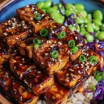 Un délicieux bol de tofu mariné dans une sauce teriyaki sucrée-salée, servi sur un lit de riz complet avec des légumes croquants.