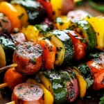 Une recette estivale de brochettes de légumes et saucisses fumées, simple et délicieuse à préparer.