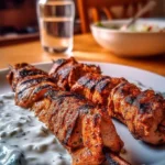 Savourez des brochettes d’agneau juteux marinées et grillées, accompagnées d’une sauce au yaourt crémeuse et fraîche.