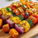 Des brochettes colorées de légumes et de patates douces grillées, parfaites pour l’été.