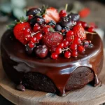 Un gâteau au chocolat moelleux, nappé d’une ganache crémeuse et décoré de fruits rouges, parfait pour impressionner vos invités.