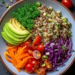 - Dans un bol, dispose le quinoa cuit, puis ajoute l’avocat, les tomates cerises, la carotte, le chou rouge, et parseme de persil haché. C’est là que la magie opère !