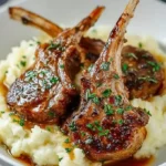 Un plat élégant de côtelettes d’agneau juteuses accompagnées d’une écrasée de pommes de terre crémeuse, parfait pour impressionner vos invités.