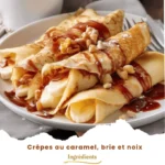 Savourez des crêpes légères et moelleuses garnies de brie fondant, nappées de caramel doré et parsemées de noix croquantes.
