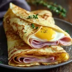 Des crêpes dorées garnies de jambon savoureux et d’œufs, idéales pour un brunch ou un dîner réconfortant.