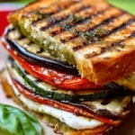 Un délicieux croque-monsieur végétal rempli de légumes grillés et de mozzarella, parfait pour un déjeuner sain et savoureux.
