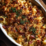 Et parlons pâtisserie : non seulement tu obtiens ces pommes de terre fondantes, mais le mélange de lardons et d’oignons caramélisés apporte une richesse irrésistible. Ajoute ce crumble doré sur le dessus, et c’est comme si chaque bouchée te faisait donner des petits coups de pied de gloire dans la cuisine. Qui a besoin d’une étoile Michelin quand on a du bacon, des patates et un four ?