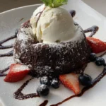 Un délicieux dessert au chocolat avec un cœur coulant, servi avec de la glace vanille et un mélange de fruits frais.