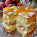 - Assemblage : Une fois que le gâteau est refroidi, découpez-le en deux dans l’horizontale. Garnissez la partie inférieure avec la crème au mascarpone et placez-y les pêches tranchées.