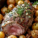 Un succulent gigot d’agneau mariné aux herbes et accompagné de pommes de terre rôties, parfait pour impressionner vos invités.
