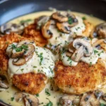 Un plat de poulet croustillant avec une sauce crémeuse aux champignons et au parmesan, parfait pour un dîner mémorable.