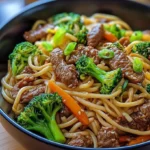 Un plat rapide et savoureux de nouilles au bœuf mariné avec du brocoli croquant, parfait pour un dîner délicieux.