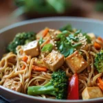 Un plat savoureux de nouilles avec des légumes colorés et du tofu, enrobé d’une sauce aux cacahuètes délicieuse.