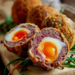 Un plat réconfortant et savoureux, les Oufs à l’écossaise sont des œufs durs enrobés de viande croustillante, parfaits pour toute occasion.