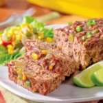 Pain de viande à la mexicaine servi avec des garnitures colorées.