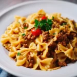 Pâtes crémeuses au boeuf haché, plat savoureux et réconfortant.