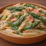 Un plat crémeux et savoureux de penne aux asperges et saumon fumé, parfait pour un repas rapide et délicieux.