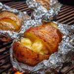 Des pommes de terre moelleuses cuites à la perfection sur le barbecue, enveloppées dans du papier aluminium pour un plat réconfortant.