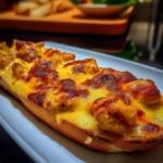 Un délicieux plat alliant poulet juteux, curry épicé et fromage fondant sur du pain croustillant, parfait pour impressionner vos invités.