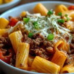 Un plat réconfortant de rigatonis avec du bœuf haché, des tomates, et du fromage fondant, parfait pour un dîner décontracté.