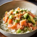 Un plat frais et savoureux qui marie riz, truite fumée et avocat pour une expérience culinaire estivale.