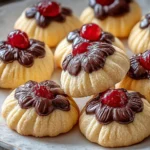 7. Place une cerise confite au centre de chaque sablé avant que le chocolat ne durcisse complètement.