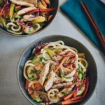 Une délicieuse salade de nouilles udon avec du poulet tendre, des légumes croquants et une vinaigrette asiatique savoureuse.