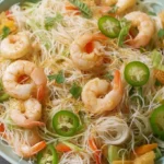 Une salade fraîche et colorée de vermicelles de riz, crevettes et légumes, parfaite pour les chaudes journées d’été.