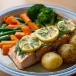 Un plat délicieux et sain de saumon avec une touche de citron et d’aneth, accompagné de légumes vapeur.