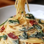 Un plat réconfortant de spaghetti avec des épinards et une riche crème de tomates séchées, prêt en moins de 30 minutes.
