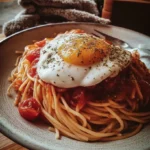 Un plat de spaghetti réconfortant avec une sauce tomate riche et un œuf frit crémeux sur le dessus.
