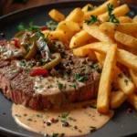 Un plat réconfortant de steak tendre, enrobé de poivre croustillant et nappé d’une sauce crémeuse, accompagné de frites dorées.