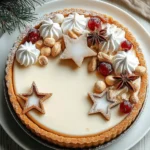 Décorer la tarte: Dispose les biscuits étoiles, les cerises confites, les noisettes caramélisées et les touches de chantilly. Saupoudre légèrement de cacao et ajoute les perles argentées pour le côté festif. Brille de mille feux!