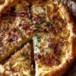 Pourquoi cette tarte est-elle si incroyable ? Imagine ceci : une croûte dorée et croustillante, remplie de pommes de terre fondantes, d’oignons caramelisés et de lardons croustillants qui chantent la symphonie du yum. 😍 C’est un plat qui réchauffe le cœur et qui est parfait pour un repas détendu après une longue journée. Tu te souviendras des repas en famille, blottis autour de la table, tous ces rires et ces histoires. Une bouchée et tu seras transporté dans un monde où les soucis n’existent pas (sauf peut-être le fait de ne pas en avoir assez).