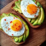 - Assembler la tartine : Sur chaque tranche de pain, étale généreusement l’avocat écrasé, puis ajoute un œuf au plat par-dessus. Complète avec quelques rondelles de piment et saupoudre de poivre ainsi que de graines selon tes préférences. Servez immédiatement, tant que le pain est croustillant et que le jaune est encore coulant. Bon appétit !