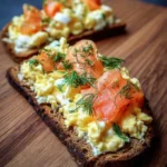 Une tartine délicieuse à base d’œufs brouillés crémeux, de saumon fumé et d’aneth frais, parfaite pour un brunch décontracté.