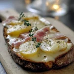 Une tartine savoureuse avec du fromage Reblochon, des pommes de terre, et des lardons fumés, parfaite pour réchauffer les cœurs.