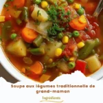 Salut les foodies ! Si vous n’avez pas encore goûté à ma recette de Soupe de Légumes de Mamie Traditionnelle, c’est le moment de vous rattraper. Cette soupe a le pouvoir magique de ramener des souvenirs d’enfance, comme les dimanches pluvieux assis à la table de la cuisine à se gaver de pain frais. Mais ne vous laissez pas tromper, ce n’est pas un plat compliqué ! Préparez-vous à découvrir la magie d’un pot qui bouillonne et des légumes qui s’invitent à la fête.